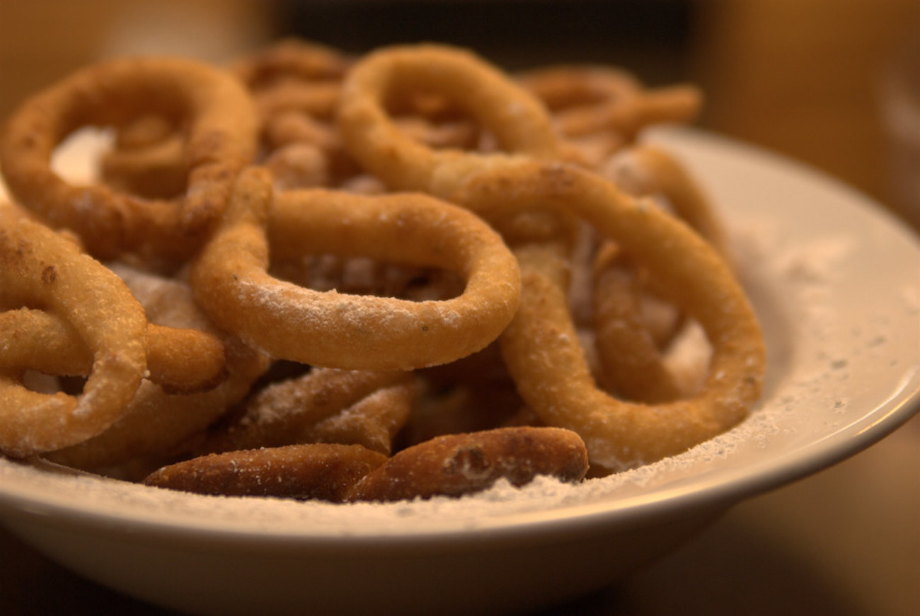 Lalangia are a type of fried dough ribbons which are found in southern Greece, in the Messinian and Laconian regions, and almost every home there will have these. They are typically made on Christmas Eve in a variety of shapes and sizes. It is a good addition to sweet and savory dishes. With sweet dishes, lalangia pairs well with honey, walnuts, raisins, and cinnamon. Today, the popular Mani lalangia are sold in many pastry shops in the area.
