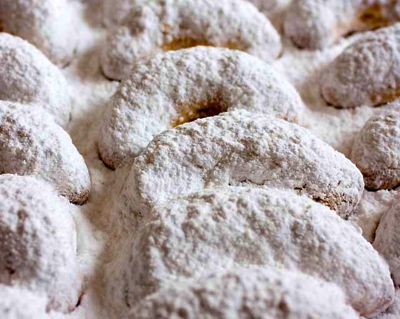 Kourabiedes are famous as a Christmas cookie in Greece, and the main ingredients are flour, butter, almonds, sugar, and brandy. The most important part is the powdered sugar on top, which add a wonderful sweetness when you bite into them. Kourabiedes have their roots in Persia in the 7th century, and they eventually made their way to Greece.