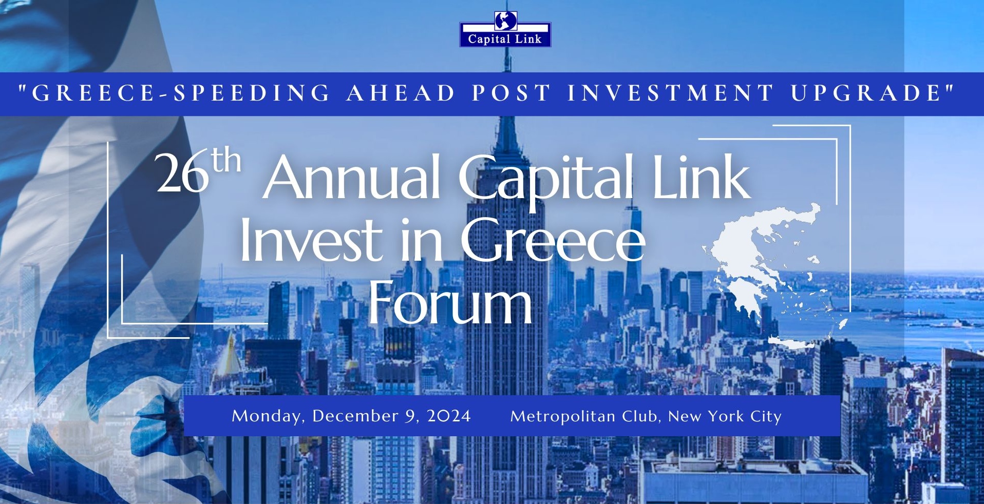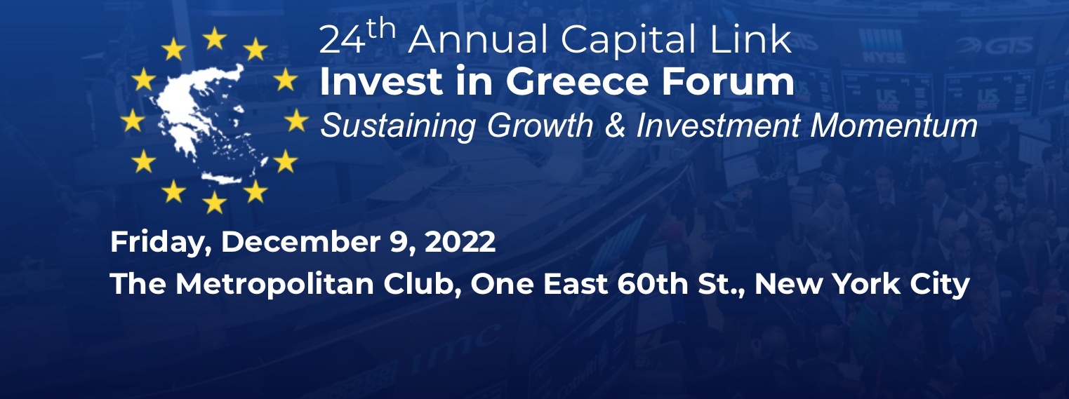 Das jährliche internationale Forum von Capital Link kehrt am Montag, dem 9. Dezember 2024, nach New York City zurück. Unter dem Titel „Greece – Speeding Ahead Post Investment Upgrade” findet diese renommierte Veranstaltung persönlich im Metropolitan Club statt. Das Forum gilt als der am längsten bestehende Investitionsgipfel über Griechenland im Ausland und dient als wichtige Plattform zur Stärkung der Geschäfts- und Investitionsbeziehungen zwischen den Vereinigten Staaten und Griechenland, während es Griechenland als erstklassiges globales Investitionsziel in den Vordergrund rückt.