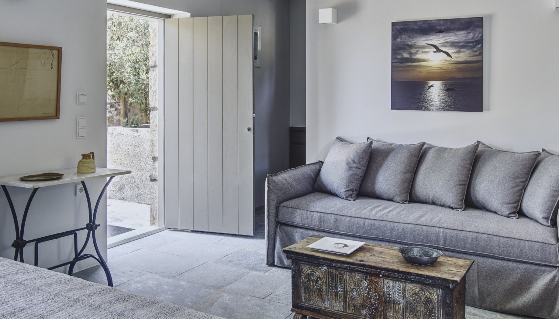 Besucher können sofort eine Ruhe spüren, wenn sie über das Grundstück spazieren. Natürliche Elemente wie Pistazien-, Feigen- und Olivenbäume prägen die Landschaft. Alle Gäste der Pension können den Sonnenuntergang genießen, während sie auf den Steinbänken sitzen, auf denen früher Nikolaou, Moralis, Kapralos, Elytis und andere Familienmitglieder und Freunde der Nikolaous saßen. Das Haus gehört der Familie von Angela Nikolaou, Theodore, Christina, Daphne und Philippos Zoumboulakis.