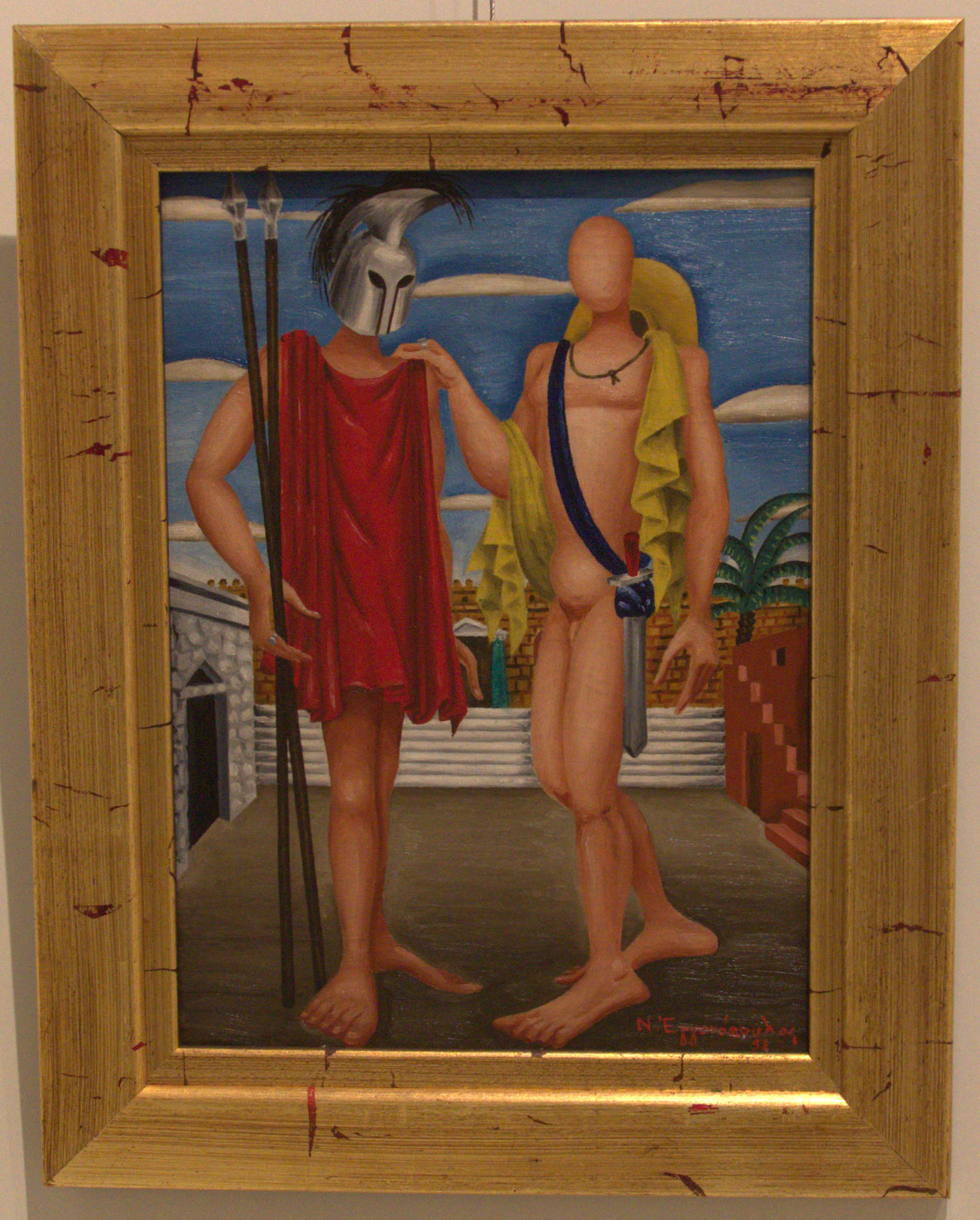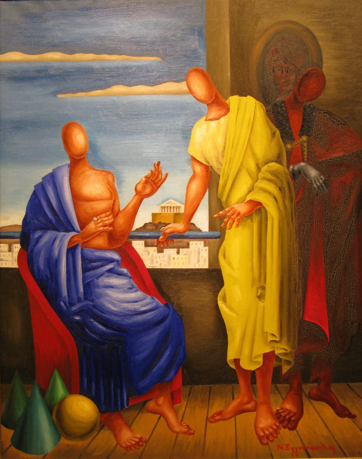 „So tragen die Gesichter in Engonopoulos' Gemälden nicht das Element des Göttlichen. Stattdessen sind es dionysische oder apollinische Helden, die oft den Künstler selbst auf geheimnisvolle Weise darstellen, in einer traumhaften Atmosphäre, extravagant tragisch. Seine Gemälde erzählen Mythen, historische Fakten oder Alltagsereignisse, in denen unkonventionelle Zeit, die Paradoxie der Formen und die schwebende Symbolisierung sie in Orte der Faszination und des Geheimnisses verwandeln. Hier liegen seine Bezüge zur griechischen Mythologie“, sagte Sorogas.