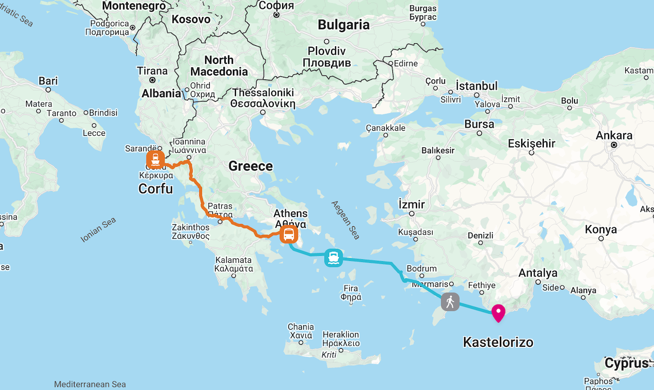 Ακόμα και με αεροπλάνο, η διαδρομή από την Κέρκυρα στο Καστελόριζο δεν είναι γρήγορη. Στην καλύτερη περίπτωση, το ταξίδι σας θα διαρκέσει περίπου 15 ώρες, σύμφωνα με το Rome2Rio. Αυτό συμβαίνει επειδή πρέπει πρώτα να περάσετε από την Αθήνα και τη Ρόδο με αεροπλάνο πριν φτάσετε στο Καστελόριζο.