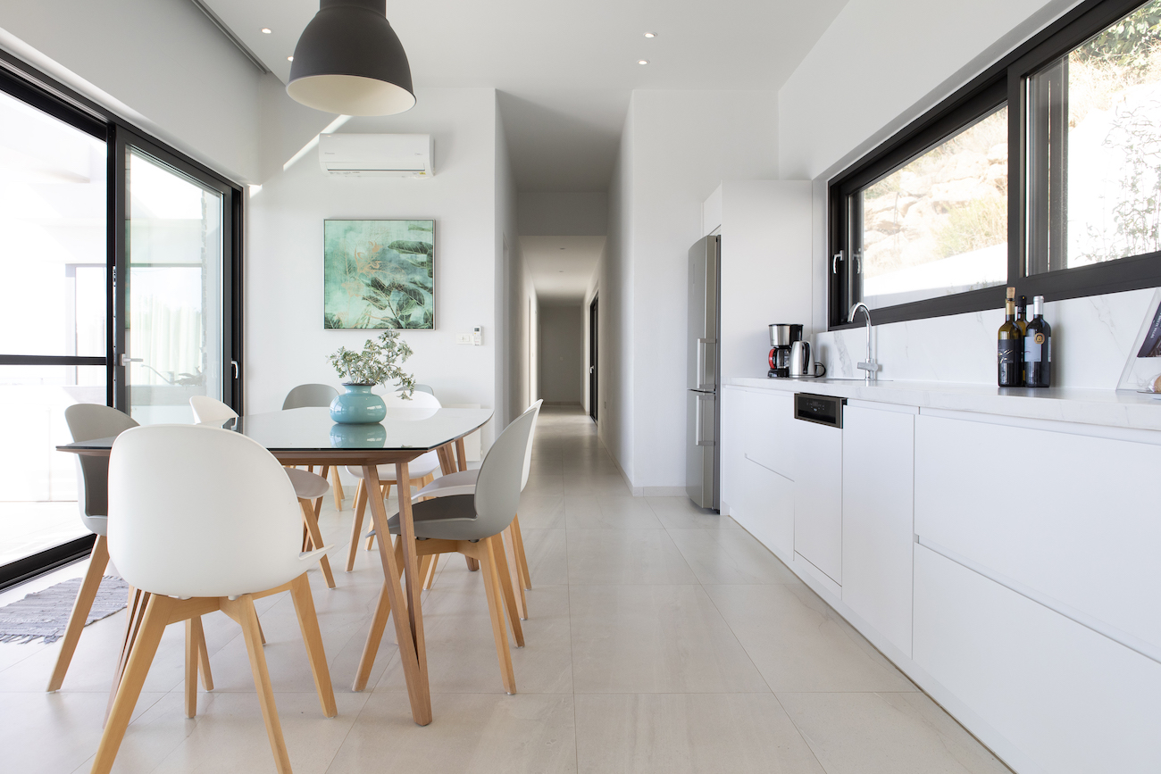 Το ζευγάρι επέλεξε να αγοράσει έπιπλα από την τοπική αγορά αντί να πάει στην ηπειρωτική Ελλάδα, ώστε να υποστηρίξει τα τοπικά καταστήματα της Κρήτης. «Αυτό απαιτούσε περισσότερο χρόνο και προσπάθεια, αλλά είμαστε χαρούμενοι που το κάναμε». Ο πάγκος που επέλεξαν είναι κατασκευασμένος από σύνθετο υλικό που μοιάζει με μάρμαρο. Ο Paul και η Ellen προσθέτουν: «Εξακολουθούμε να εντυπωσιαζόμαστε κάθε φορά, γιατί είναι τόσο όμορφος. Όταν καθόμαστε στον καναπέ, μας δίνει την αίσθηση ότι βρισκόμαστε έξω».