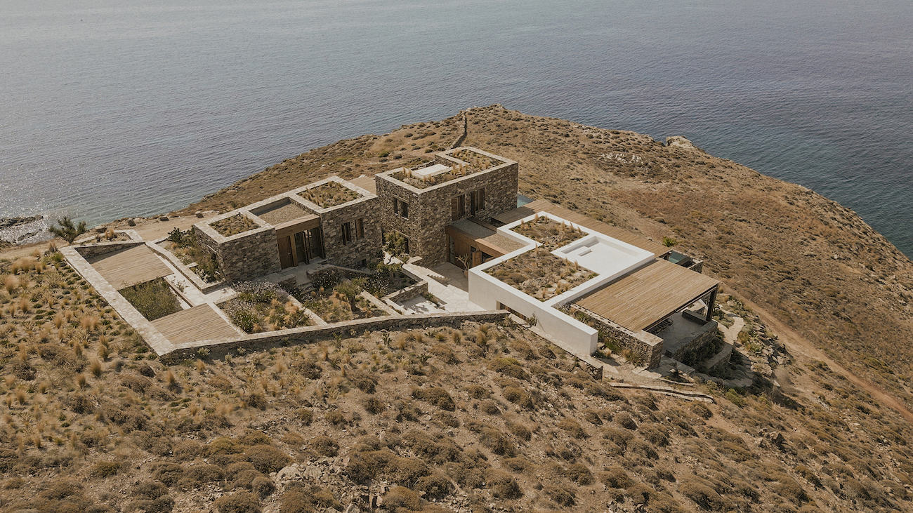 Villa Apollon by Block722 is found on the southern edge of the Greek island of Lefkada and was sold by Elxis - At Home in Greece. The project, completed in early 2021, is an ideal mix of contemporary architecture with nature, and the home respects its green surroundings. A planted roof and subterranean building techniques were used to return the landscape to its original form, and there are many local herbs and plants on the property.
