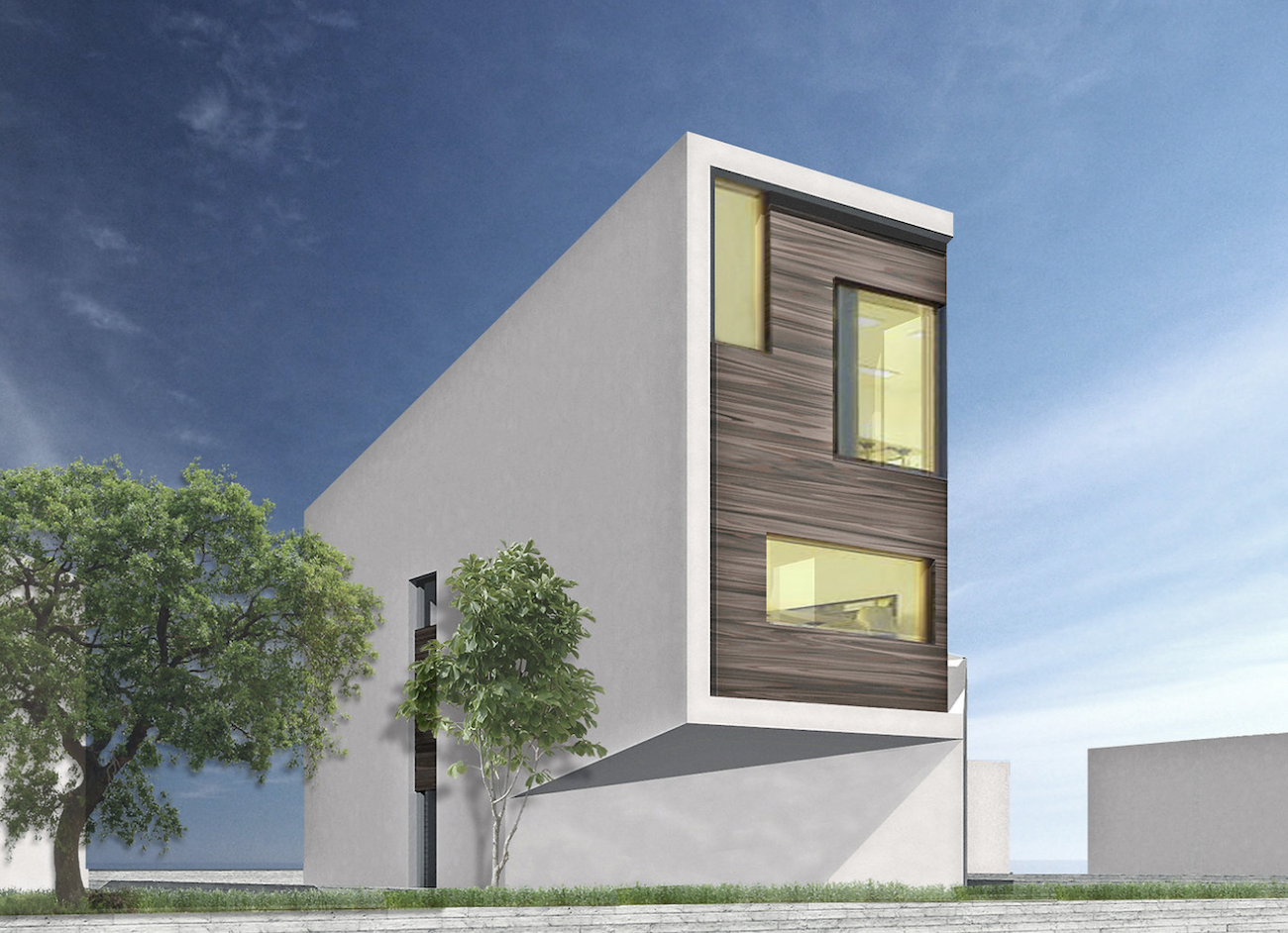 The Schema team noted that “our design concentrated on creating a house that blends with its natural environment sustaining most of the existing pine trees.” For this reason the wedge houses took a split-level design, with a wedge-shaped volume that forms the entrance and the vertical circulation leading to the main spaces of the house.