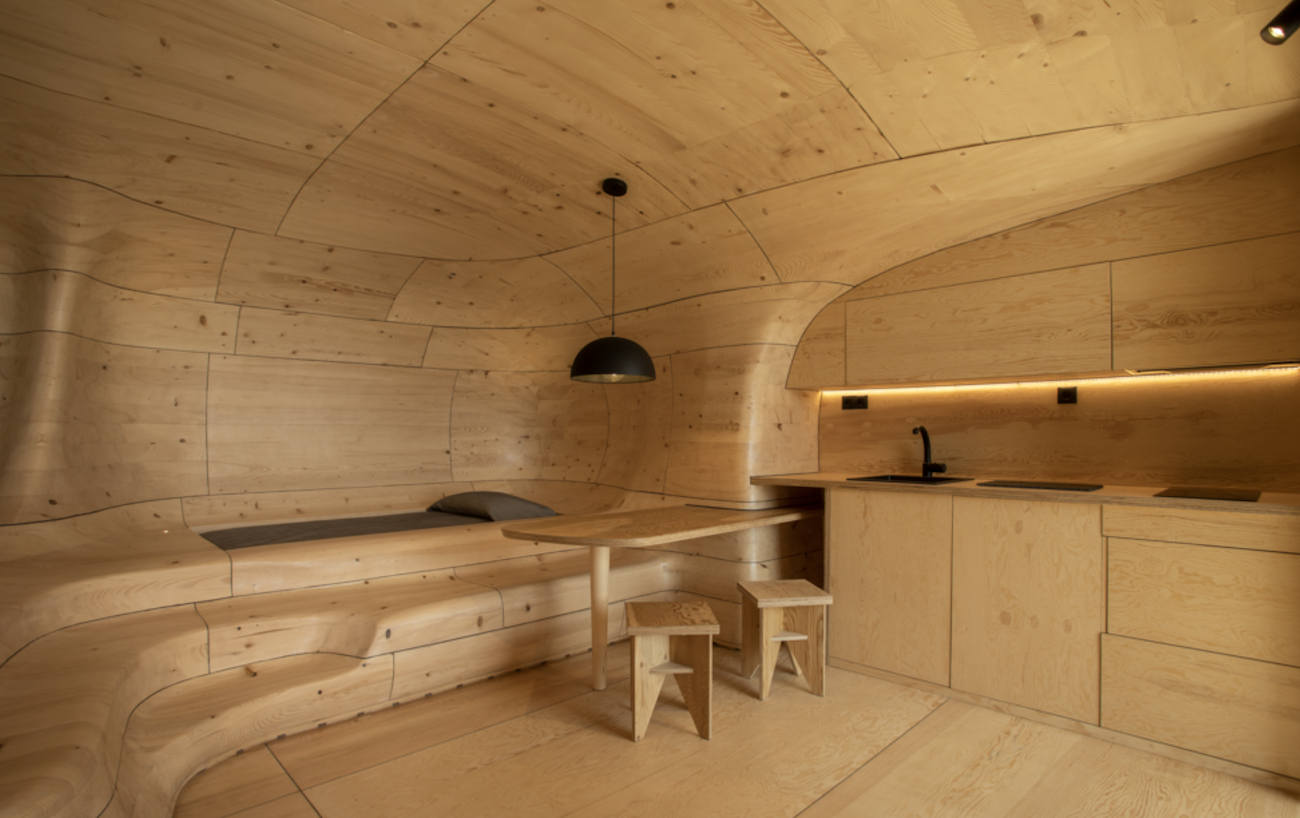 The guestroom has two sleeping areas that are found within the curved wood as well as an open-plan kitchen. The outer zone has two secondary rooms: a sitting area with a fireplace and the bathroom of the main guestroom. The curved structure is made of spruce raw timber, and the kitchen, cupboards, and floor are made of pine plywood.