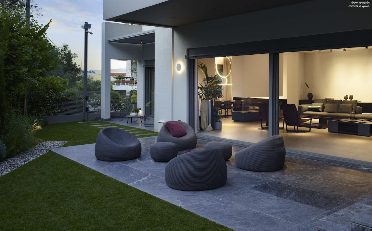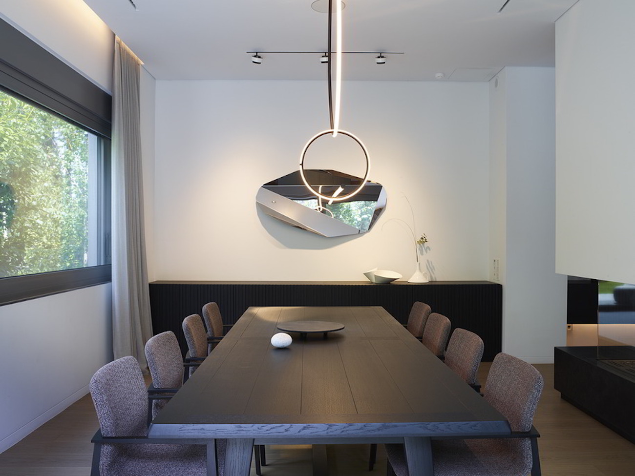 This 2019 residential project is found in the green Athenian suburb of Filothei. The 390sqm residence is an example of luxurious urban simplicity. The neutral colour palette of the walls creates a background for the dark geometric furnishings.