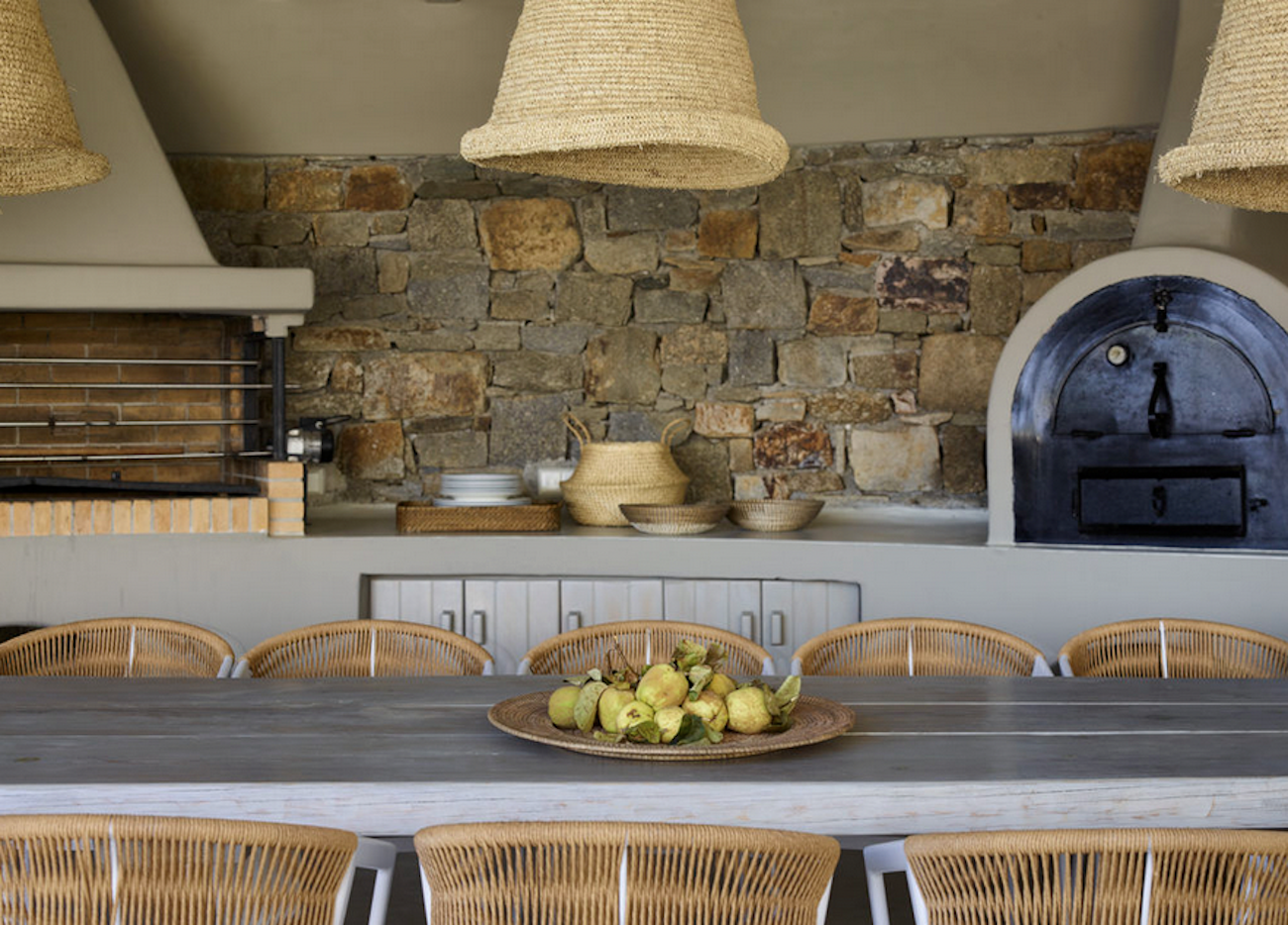 The seating area is an open space has a dining area just one step up, with a table and hidden drinks cabinet. Minimalistic design is in every space, especially in the kitchen, which has a central island with the stove and breakfast seating areas.