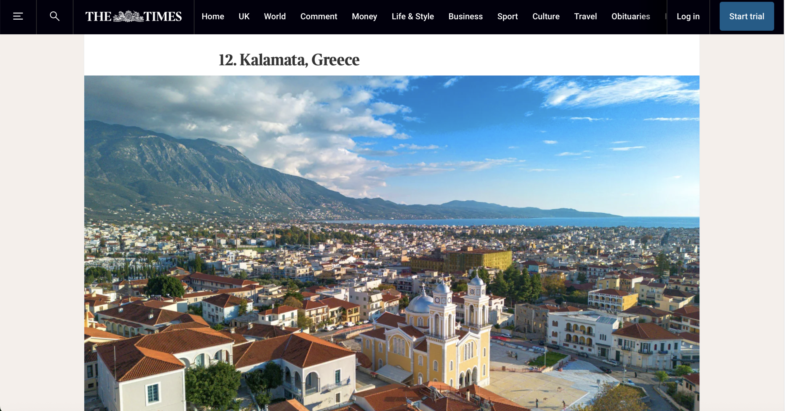 In its annual travel feature, The Times focused on European cities that offer beauty, culture, affordability, and ease of access, without the pressures of mass tourism. Kalamata was highlighted as a destination that delivers all the above.
