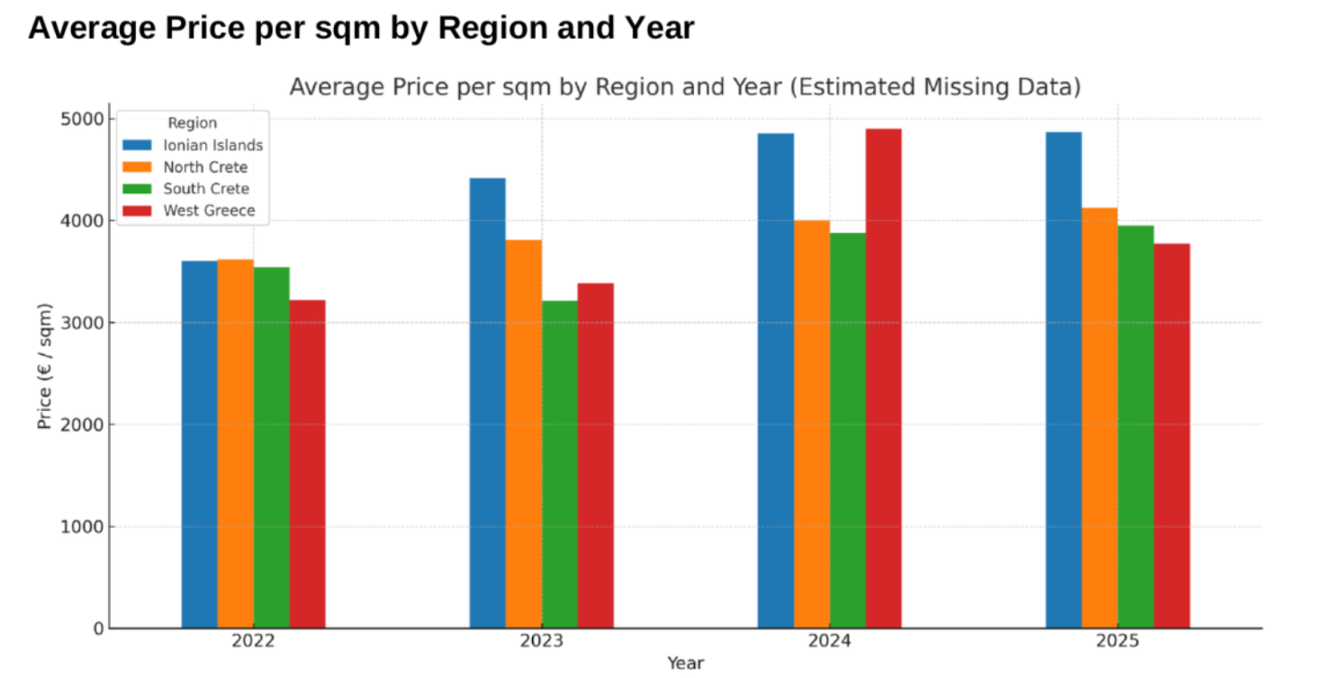 amounts to €4,866/sq.m., reflecting the supply of new luxury developments in coastal locations. Similarly, the largest increases in recent years have been observed in Western Greece due to more offerings of new high-standard projects. The upward trend in new holiday home prices has remained steady in Northern Crete, while in Southern Crete, significant increases are now being recorded following the slowdown seen in 2023.