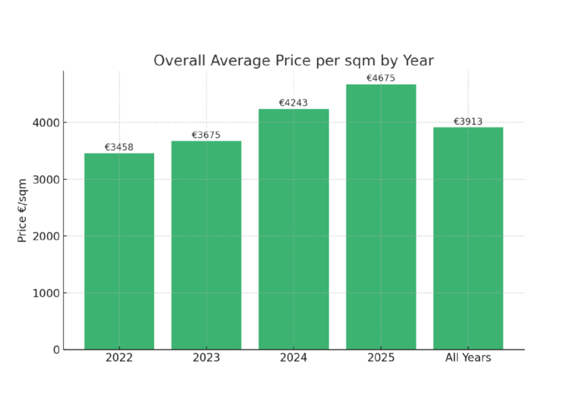 In 2025, the average sale price of a newly built home with a pool and garden amounts to €4,675/sq.m., up from €4,243/sq.m. in 2024, €3,675/sq.m. in 2023, and €3,458/sq.m. in 2022. This means that potential