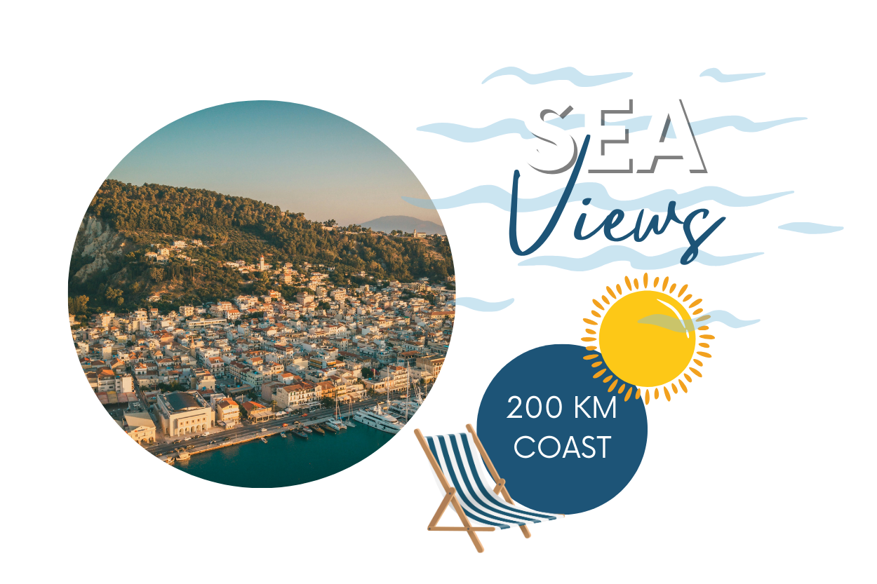 Zakynthos has one of the longest coastlines of any Greek island, at about 120 kilometers. Compare that to Santorini and Mykonos, which both have a coastline of 70-80 kilometers. Some parts of Zakynthos are undeveloped and there are many opportunities for beachfront homes. Some popular areas to get a sea view in Zakynthos are Argassi, Vassilikos, Kalamaki, Laganas, Limni Keri, and Tsilivi.