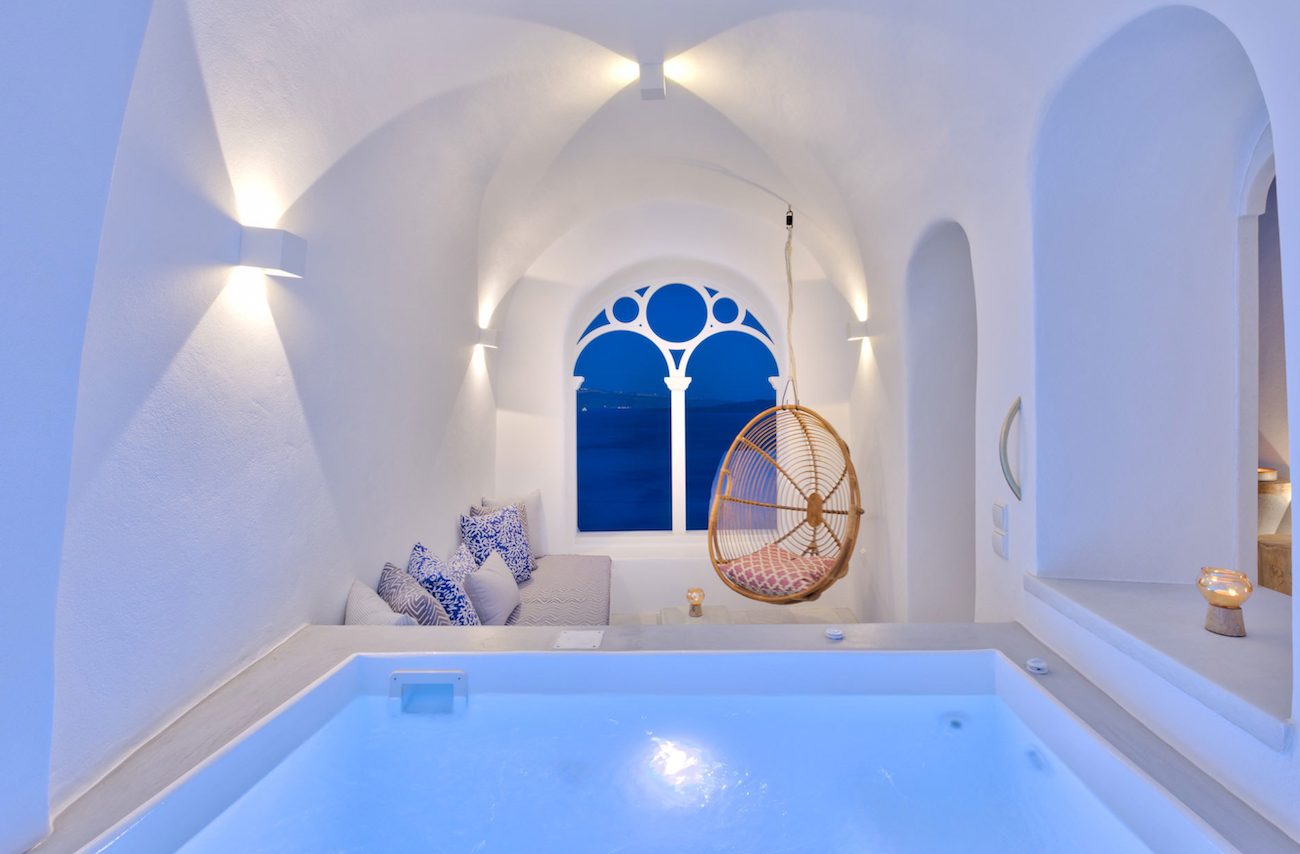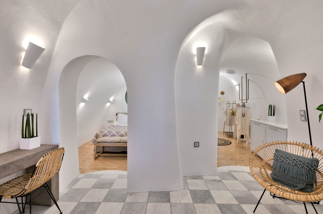 Namaste Suites are found at the most photographed part of Oia on the famous island of Santorini. The suites overlook the Aegean Sea and The Church of the Resurrection. The original cave house was built in 1900 and is made with a building material called pozzolan, which is known for its strength and insulating properties. There are many native architectural elements, and the flooring includes black and white Naxos marble and wood.