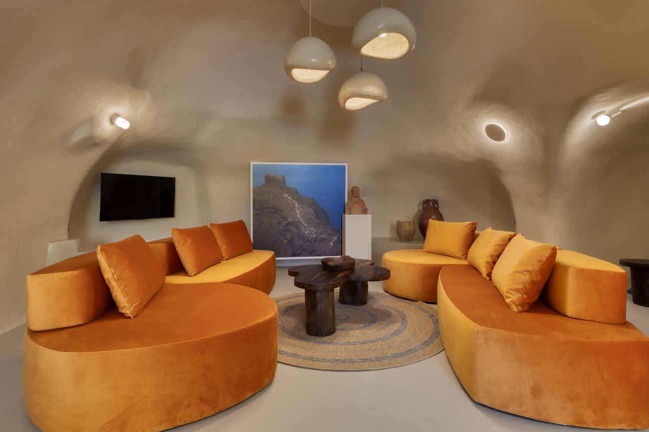 Kore is an artsy subterranean studio house in Santorini that is instantly noticeable for its curves, textures, and retro influences. The bust from an ancient Greek KORE features at the center of the living room, surrounded by two built-in sofas. Every piece of has been carefully selected to add practical use and sophistication.